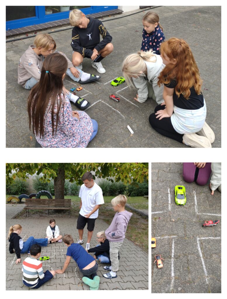 Es hat Spaß gemacht gemeinsam mit dem Fahrrad zu fahren. Unterwegs haben wir natürlich Pause gemacht, gegessen und auf einem Weg mit Kreide ganz große Schreibschriftwörter geschrieben.